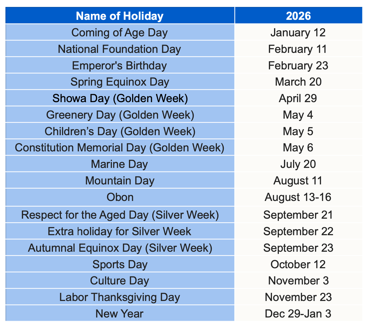 The following table is Japanese Public Holiday for 2026.