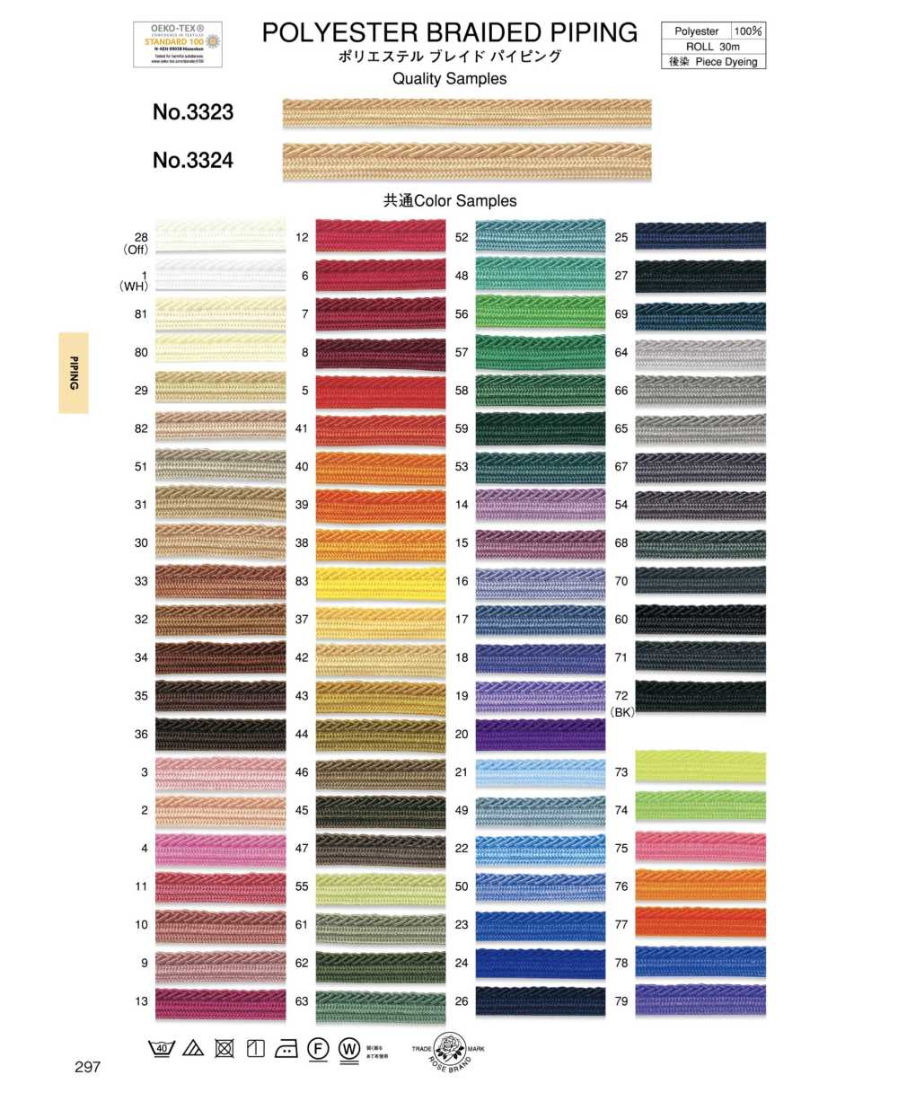 ポリエステル100%のブレイドパイピングです。カラー展開が豊富で、デザインのアクセントとしてもお使いいただけます。