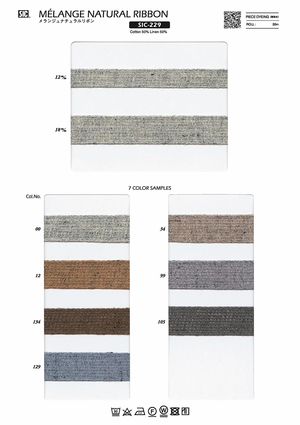◆ 2サイズ×7色 ◆ コットンの優しい風合いと素朴な麻素材の黒綿が杢調にミックスされたメランジュシリーズのリボンです。(1反=30M)【※】このサンプル帳にはSIC-169/SIC-224/SIC-229の現物サンプルが添付されています。