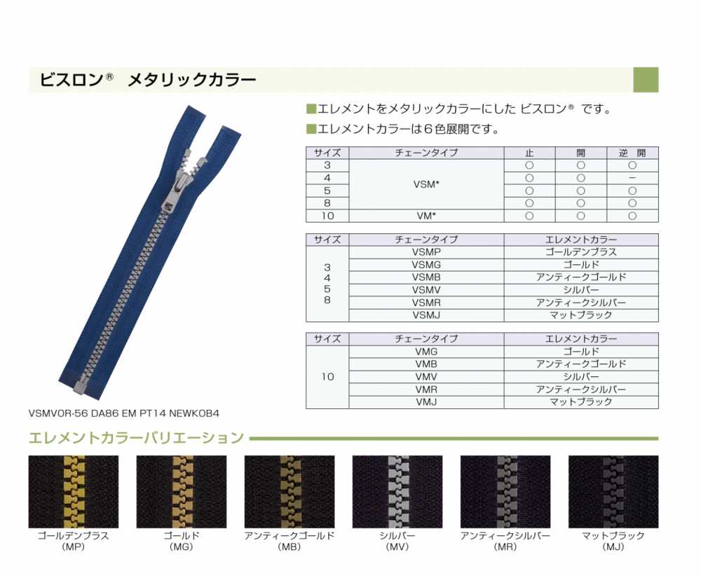 ビスロン(R) はポリアセタールなどの樹脂を射出成型してエレメントにしているファスナーです。同サイズの金属ファスナーに比べ軽いのが特徴です。エレメントをメタリックカラーにしたビスロンです。