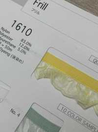ナイロン、ポリウレタン、ポリエステルを使用したストレッチ性のあるフリルテープ。